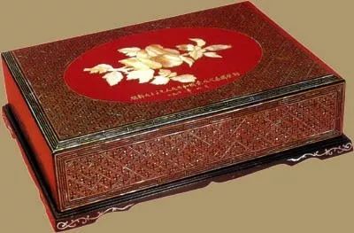 这件朱漆嵌螺钿木槿花图案长方盒是1963年9月北韩所赠。北韩的漆器制品历史悠久,颇负盛名,其中最有名的当属秦川漆器,这件就是秦川漆器的代表作。盒面上用螺钿镶嵌成木槿花图案,又称“无穷花”,它不怕风沙干旱,适应性强,在炎夏至深秋的少花季节,木槿却繁花似锦,矫健芬芳。