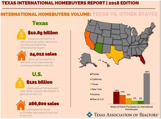 德州(楼盘)房地产商协会(TexasAssociation of Realtors)的最近一项报告显示,对于国际购房者来说,德州是热门地区之一,全美排名第三。在卖给国际买家的美国房屋中,德州占9%