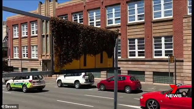 周三,塔州霍巴特CBD一块路牌被一群蜜蜂“占领”,很多路人都不敢靠近,怕被蜇伤。