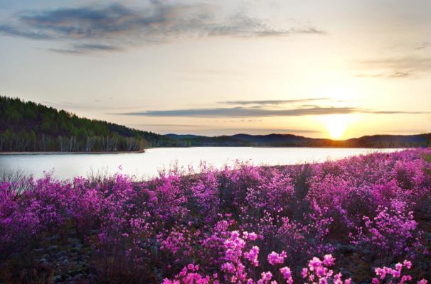 图二:达尔滨湖景区的红杜鹃迎着晨光绽放