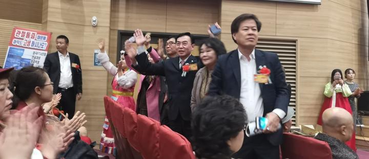 全国归韩同胞总联合会核心会长团成员入场受到与会代表的热烈欢迎。