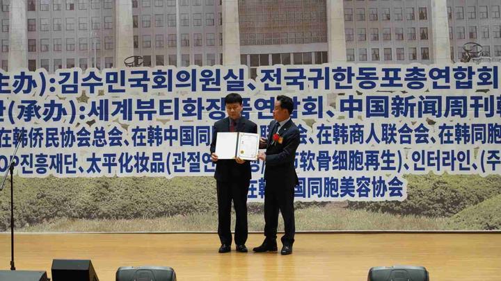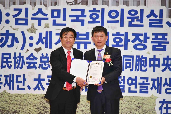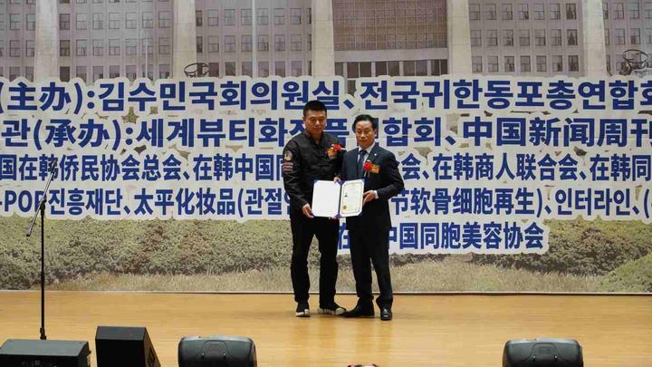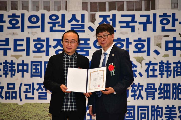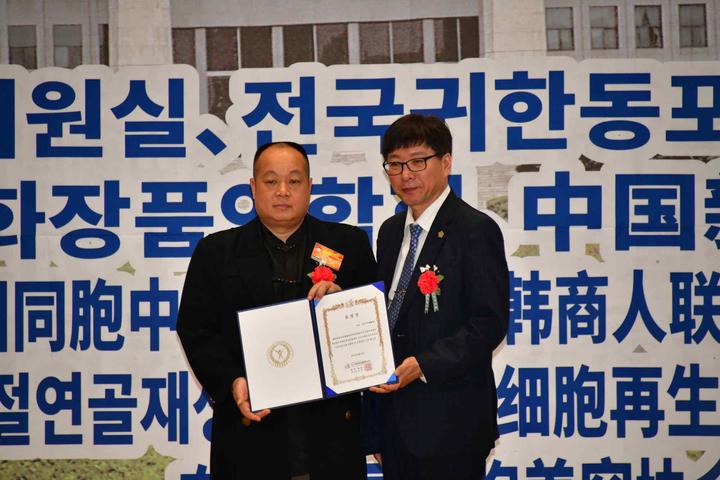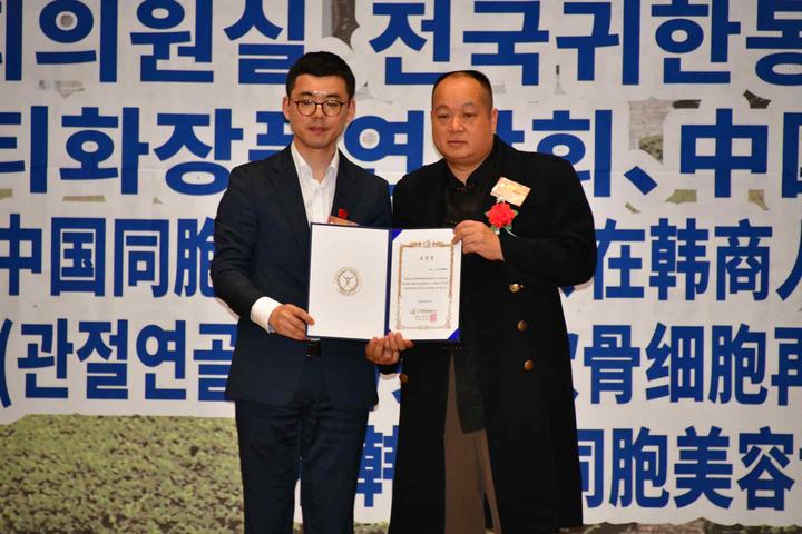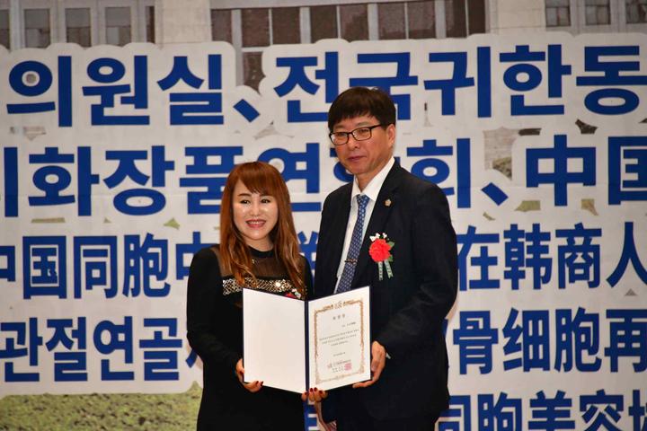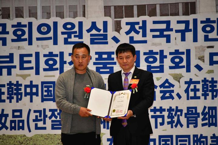 为表彰长期以来为韩中两国民间商贸往来中,做出突出贡献的在韩中国同胞优秀会员,韩国国会外交通商统一委员会,特别为中国在韩侨民协会总会首席副总会长严银河(左)颁发表彰状。