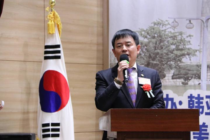全国韩籍华人总联合会总会长、韩国新华报社社长曹明权致大会开幕词。