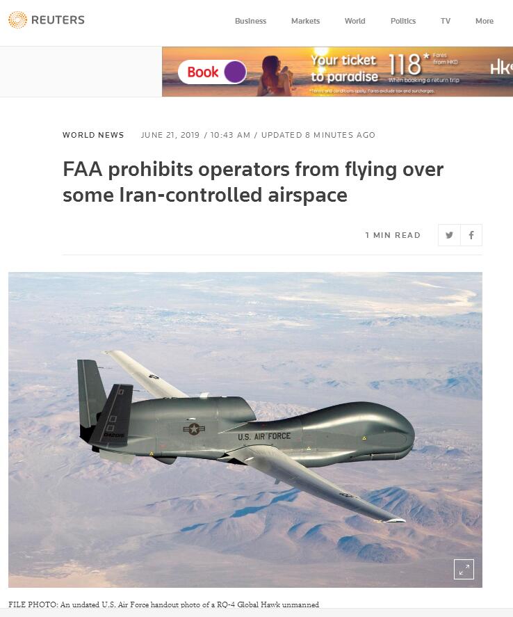 据报道,FAA在另一份给航空公司的通知中说,根据飞行跟踪应用程序,最近发生伊朗击落美国无人机事件时,民用飞机正在距离美国“全球鹰”无人机约45海里的范围内飞行。