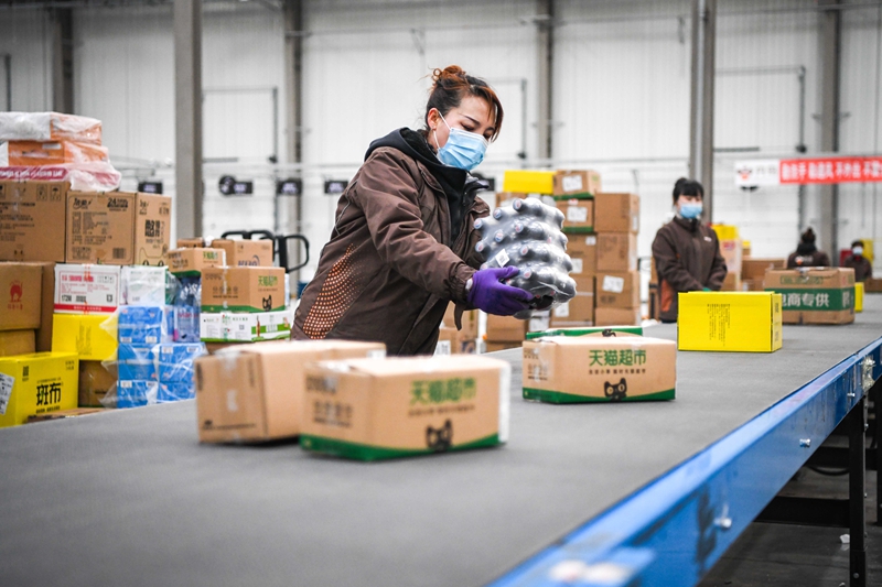 3月17日,在普洛斯哈南物流园区,哈尔滨市重点监测物流企业南京晟邦物流有限公司哈尔滨分公司工作人员对商品进行分拣。