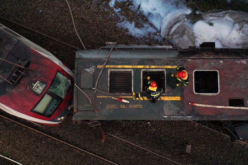 3月30日,两名消防员在火车脱轨现场作业(无人机照片)。