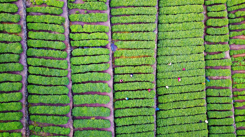 3月31日,茶农在湖北省十堰市郧阳区谭家湾镇五道岭村茶叶基地采茶(无人机照片)。
