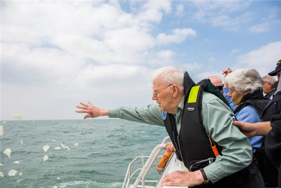 前来凭吊的后代向大海撒花,表达深深的哀思