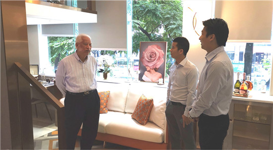 ▲云嘉集团荣誉顾问熊德龙先生在陆加壹集团董事长、云嘉村村长蓝庆文(中),云嘉集团总裁严考鑫(右)的陪同下参观云嘉倚翠公寓的爱马仕风格样板房(资料图)。
