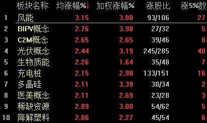 概念板块近乎全红,风能、BIPV概念、C2M概念、光伏概念、生物质能、多晶硅等板块涨幅靠前;数字货币、知识产权、RCS概念三板块下跌。
