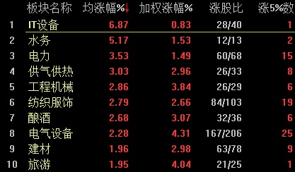 盘面上,行业板块全线上涨,IT设备、水务、电力、供气供热、工程机械、纺织服饰、酿酒等板块涨幅居前。