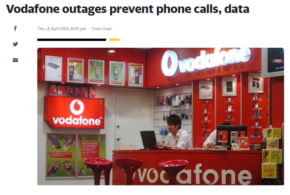 雅虎新闻报道,针对沃达丰的中断问题,网站downdetector.com.au称,9日上午11时许,沃达丰手机用户开始报告出现问题,在中午前投诉达到高峰。