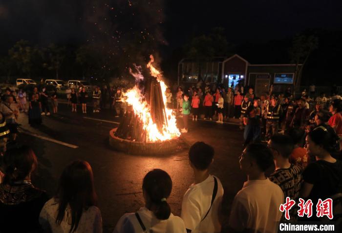 7月29日晚,“激情火把节 最炫民族风”2024年凉山彝族火把节的“重头戏”火把狂欢夜在四川省西昌市举行,上万名当地民众和游客点燃手中的火把,载歌载舞欢庆彝族最重要的节日之一——火把节,沉浸式体验火把互动的激情与热烈。图为游客和当地民众围观刚点着的火把堆。中新社记者 王磊 摄