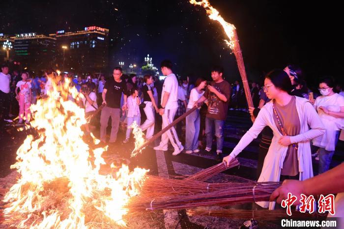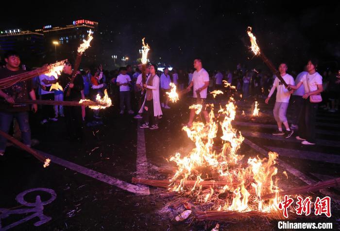 7月29日晚,“激情火把节 最炫民族风”2024年凉山彝族火把节的“重头戏”火把狂欢夜在四川省西昌市举行,上万名当地民众和游客点燃手中的火把,载歌载舞欢庆彝族最重要的节日之一——火把节,沉浸式体验火把互动的激情与热烈。图为游客和当地民众围着火把堆点起火把。中新社记者 王磊 摄