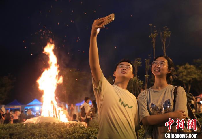 7月29日晚,“激情火把节 最炫民族风”2024年凉山彝族火把节的“重头戏”火把狂欢夜在四川省西昌市举行,上万名当地民众和游客点燃手中的火把,载歌载舞欢庆彝族最重要的节日之一——火把节,沉浸式体验火把互动的激情与热烈。图为两位游客在火把堆前自拍。中新社记者 王磊 摄