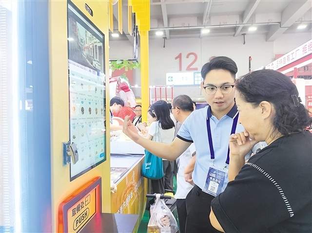 台山国粮集团工作人员向采购商介绍珍香方便米饭自动售卖机功能。