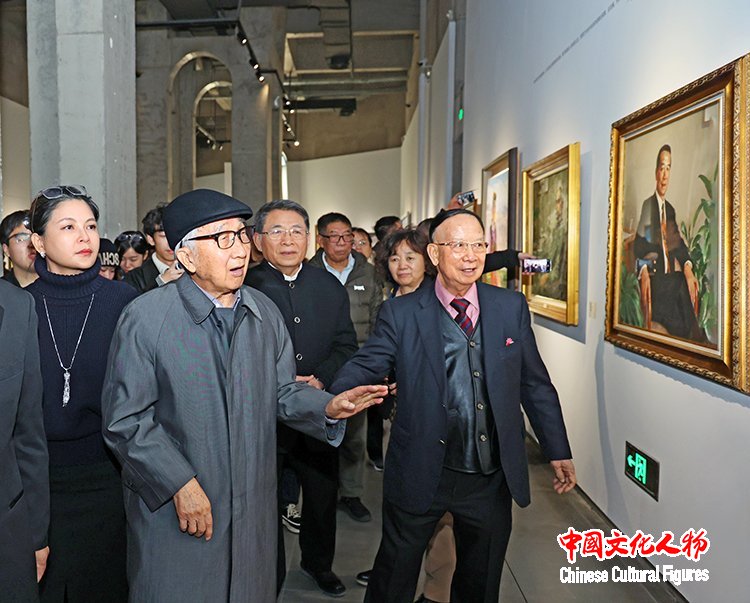 中央美术学院原院长靳尚谊与参观展览的艺术家嘉宾在展览作品前交流