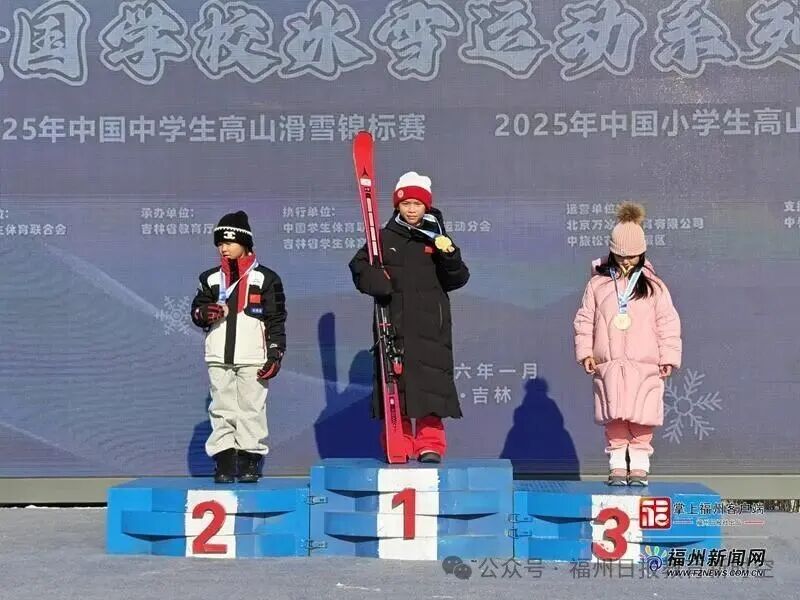 在近日举行的2025年中国中学生高山滑雪锦标赛与中国小学生高山滑雪冬令营中,福州市青少年滑雪队队员、福州市鼓楼实验小学二年级小将林雨萱勇夺女子丙组冠军,为福建摘得青少年滑雪项目全国大赛首金。