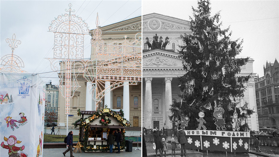 新年前夕莫斯科大剧院门前的新年圣诞树,2015/1983年对比照。(网页截图)