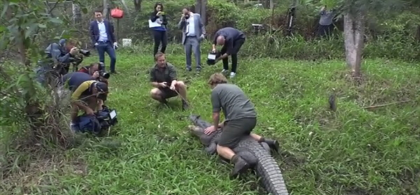 当然,之前就有猛士自晒伸手放入短吻鳄血盆大口的惊魂场面,现在澳大利亚的动物工作人员更是骑到短吻鳄背上,用手紧扣其血盆大口。