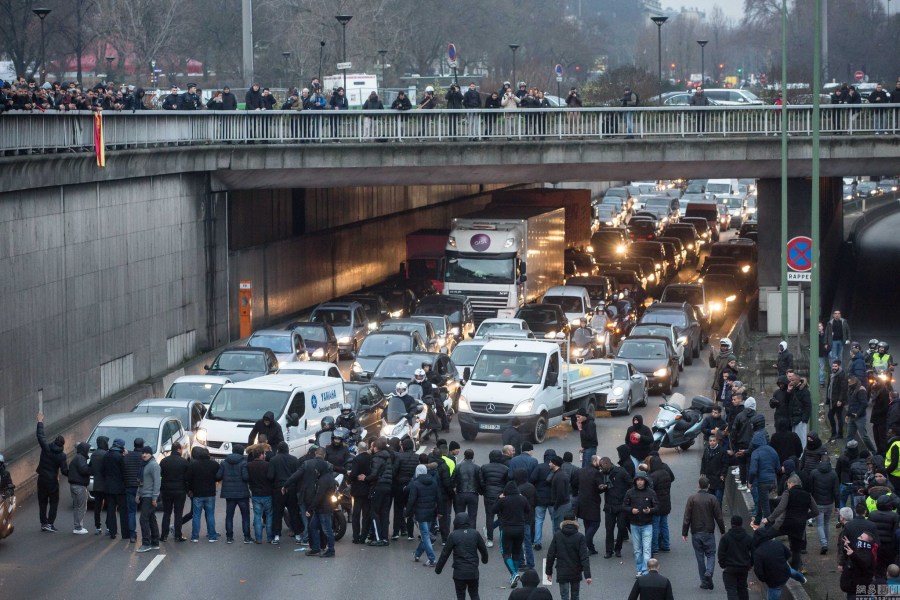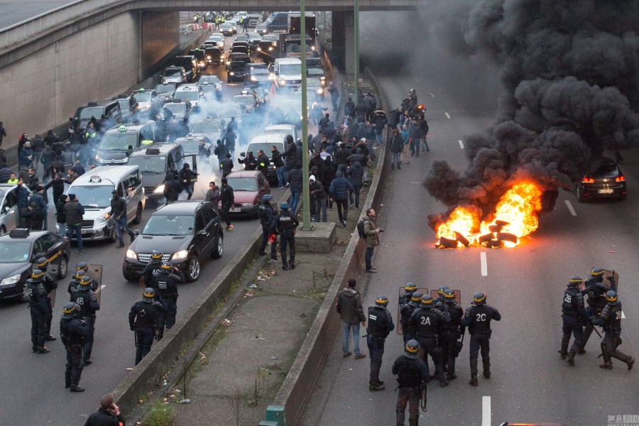 当地时间2016年1月26日,法国巴黎,法国出租车司机游行抗议叫车软件优步。