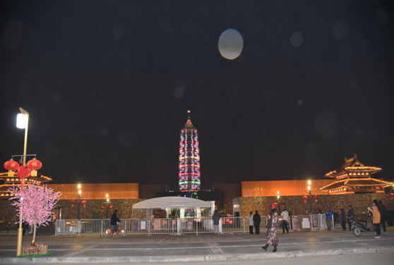 当晚天上,大报恩寺里的轻质保护塔就亮起了五彩灯,在寒冷的夜空中,显得格外绚丽耀眼。在传统花灯艺人的巧手扎制下,毁于太平天国战火的大报恩寺塔琉璃门,重现世间,高5.6米、长5.5米的四道琉璃门,精美的琉璃花纹在灯彩的映照下,栩栩如生。琉璃门彩灯闪烁,映衬着身后不断变幻色彩的宝塔,十分的好看,拍照的人络绎不绝。
