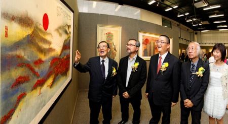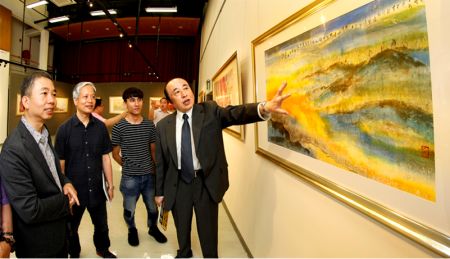 徐嘉炀向香港艺术发展局艺术教育组主席梁崇任,中国艺术研究院博士生导师、美术理论家王镛,中国艺术研究院博士生导师陈醉,澳门颐园书画会理事长李德胜等领导及艺术家介绍展览作品 中新社发 王保胜 摄