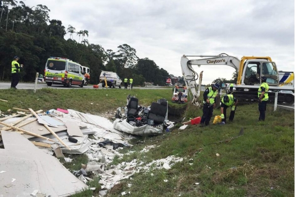 布鲁斯高速公路(Bruce Highway)近阳光海岸帕姆维(Palmview)路段卡车侧翻,2名男子被困驾驶室,随后获救。