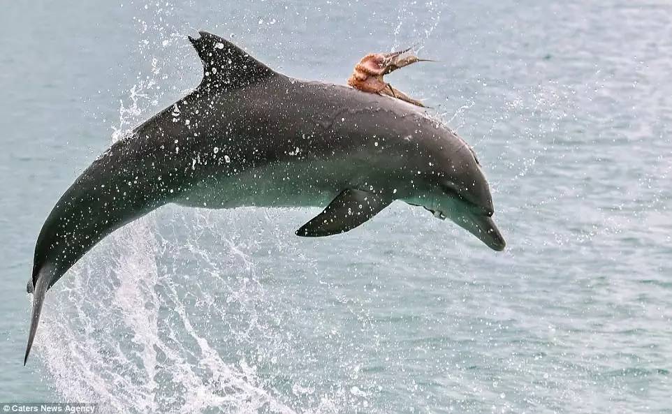 海豚看起来玩得超级High,可怜的章魚紧紧抓住海豚怕再次被甩...