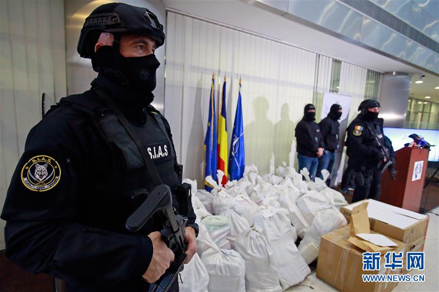 日前,在罗马尼亚布加勒斯特举行的新闻发布会上,警察在袋装的可卡因旁警戒。罗马尼亚有组织犯罪和恐怖主义调查局26日宣布,在多瑙河三角洲地区查获了逾1吨可卡因。