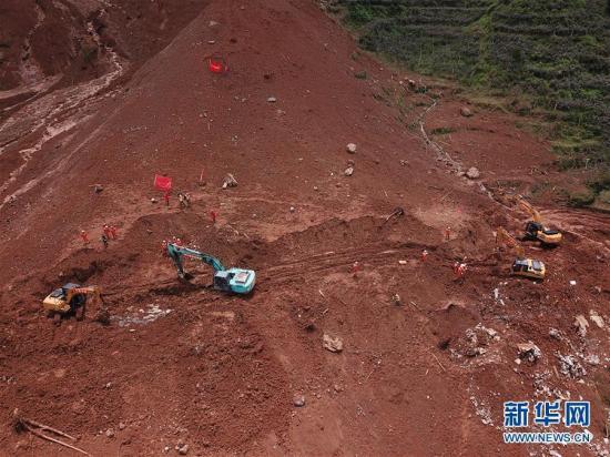 7月25日,救援人员在山体滑坡现场操作工程机械开展救援(无人机拍摄)。新华社记者杨楹摄中新网贵州水城7月27日电(袁超刘鹏蒲文思)7月23日21时20分许,六盘水市水城县