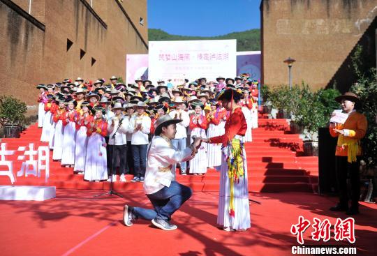 定情仪式上求婚新现场。 王磊 摄中新网盐源10月19日电 (贺劭清起钰婷)19日上午,全球66对情侣(夫妻)身着传统摩梭服装,在泸沽湖四川片区参加“筑梦山海间情定泸