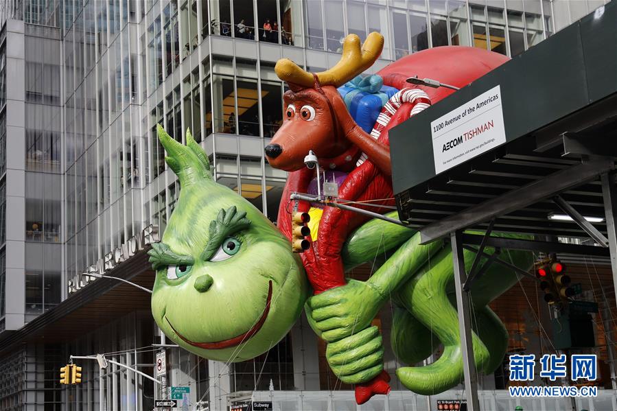 11月28日,在美国纽约举行的感恩节大游行上,卡通气球行进在曼哈顿街头。当日,2019梅西感恩节大游行在纽约举行,各式各样的玩偶气球、花车队伍在曼哈顿的摩天大楼间