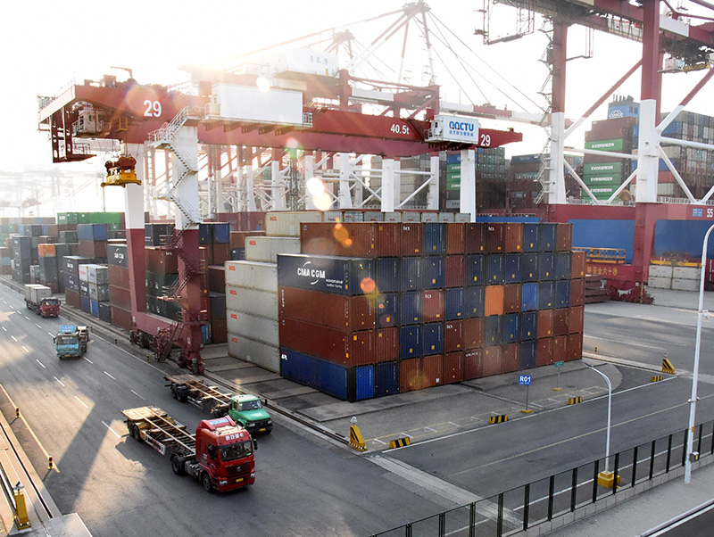 3月17日,卡车在青岛港集装箱三期码头等候装运集装箱。近日,山东港口集团各港区相关企业已全面恢复生产,船舶抵离港班次、集装箱吞吐量等均逐步回升,港口生产有序推