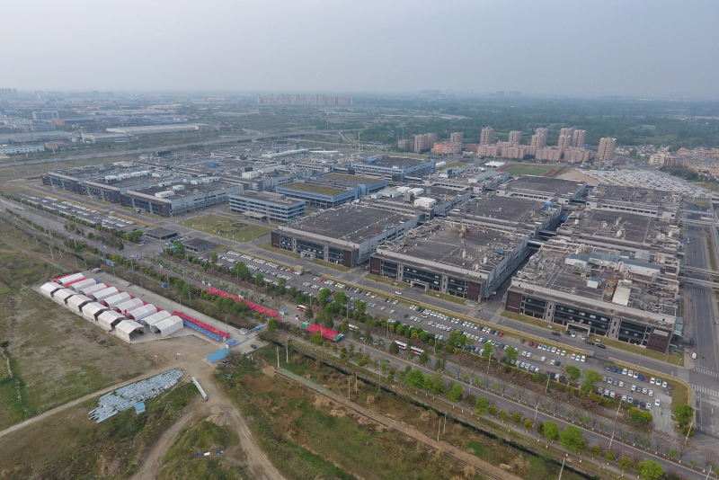 3月23日,捷普科技(成都)有限公司厂区及新搭建的员工报道处(无人机照片)。成都市崇州市经济开发区的捷普科技(成都)有限公司是一家有着3万多名员工的外资工厂。新冠