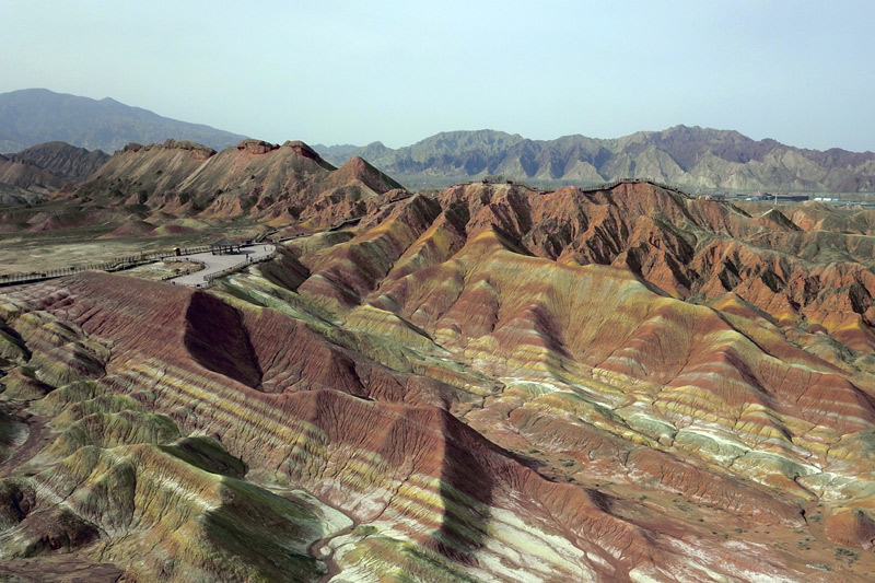 3月24日,游客在张掖七彩丹霞景区欣赏彩色丘陵景观(无人机照片)。随着疫情防控形势持续向好,作为丝绸之路上备受国内外游客青睐的“打卡地”,甘肃省张掖市七彩丹霞