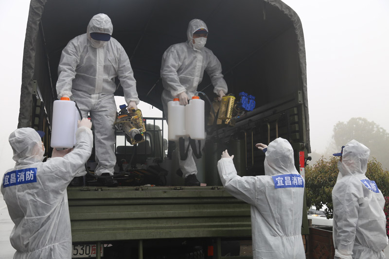 3月25日,消防员在为三峡机场候机楼消杀做准备。当日,湖北宜昌市消防救援支队组织消防员对三峡机场候机楼、停车场等机场公共场所进行全面消杀,为复工复航做好准备