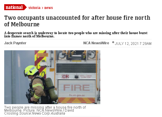 墨尔本北部11日晚一处房屋起火,两人失踪。11日23时刚过,有报道称位于Tallarook的Tallarook-Pyalong路一处房屋发生火灾,紧急服务人员接到电话赶往事发地点,据悉,该