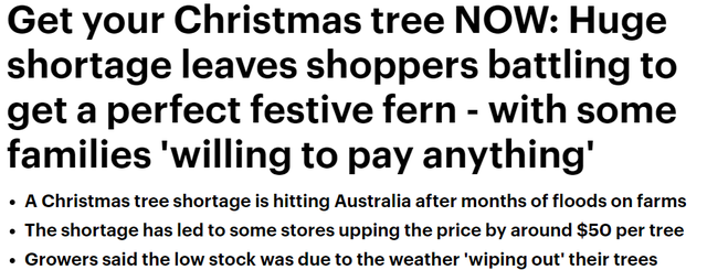 据《每日邮报》报道,受恶劣天气影响,澳洲的圣诞树出现短缺。报道中称,现在距离圣诞节还有不到3周的时间,供应商的电话已经被打爆,许多顾客纷纷表示“只要能买到圣