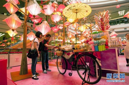 9月9日,在马来西亚首都吉隆坡,顾客在一家商场选购食品。中秋节临近,吉隆坡的一家大型商场挂起灯笼装饰。9月9日,在马来西亚首都吉隆坡,顾客从一家商场的灯笼装饰前