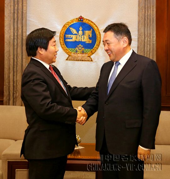 11月22日,蒙古人民党主席、国家大呼拉尔主席米·恩赫包勒德在乌兰巴托蒙古国国家宫亲切会见中国全国政协委员潘庆林率领的“一带一路”文化交流暨捐赠