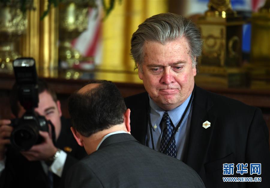 美国白宫发言人桑德斯8月18日宣布,白宫首席战略师、总统高级顾问斯蒂芬·班农离职。这是斯蒂芬·班农(右一)在美国华盛顿白宫的资料照片(2月15日摄)。新华社记者殷博