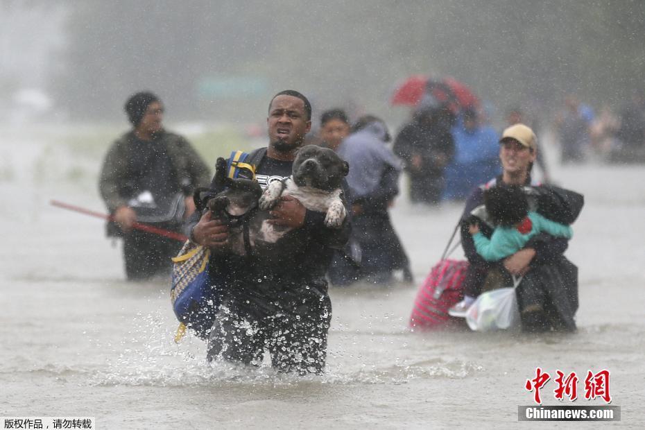 当地时间2017年8月28日,美国得克萨斯州,飓风过境带来大面积洪水,民众带着爱宠撤离灾区。飓风“哈维”8月25日在美国得克萨斯州登陆,强度最高达到四级,之后逐步减弱