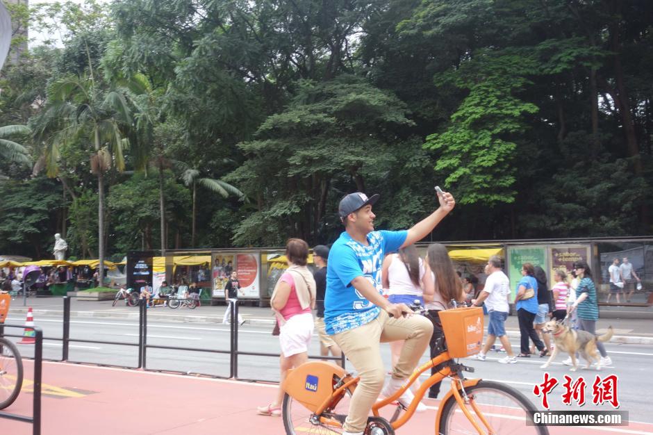 图为一名男子骑车锻炼时进行自拍。中新社记者莫成雄摄当地时间1月3日,巴西最大城市圣保罗在闹市区主街道保利斯塔大街实行交通管制,禁止机动车辆行驶,供民众休闲度