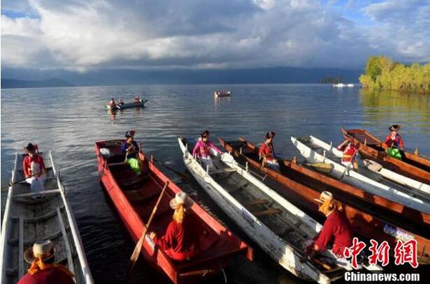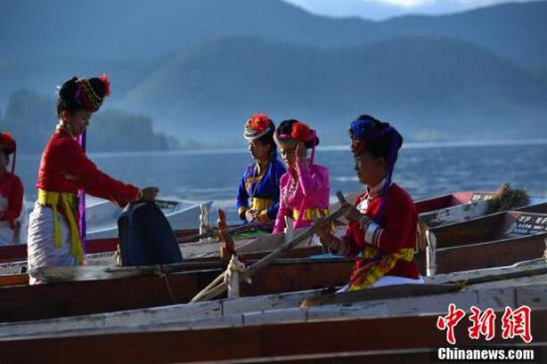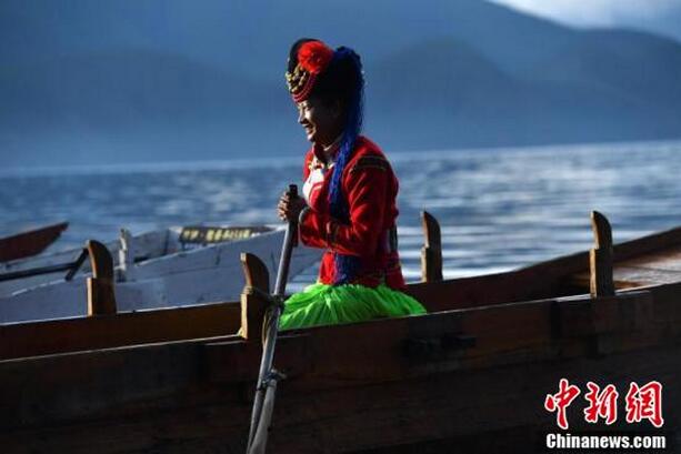 穿着摩梭服饰的女子乘坐小木船。 (张浪 摄)