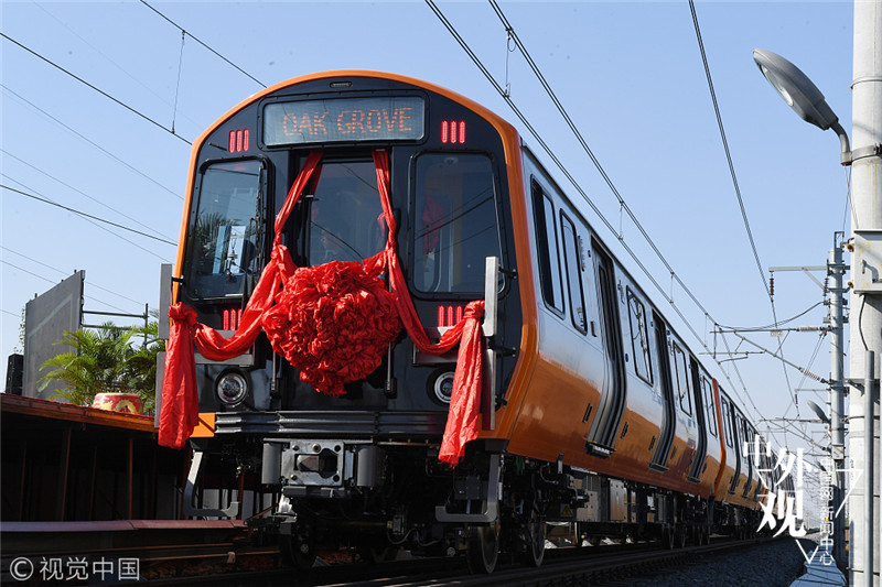 2017年10月16日,长春,由中车长春轨道客车股份有限公司研制的首批美国波士顿橙线地铁车在长春顺利下线,预计在今年12月份运抵美国。视觉中国