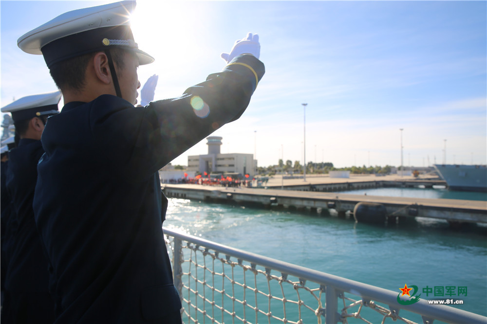 出访官兵向送行队伍挥手告别。中国军网记者 乔梦 摄