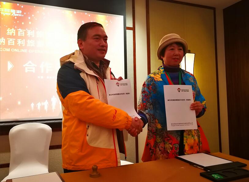 .外省旅行商加盟纳百利旅游网合作联盟,旅行商与张家界纳百利国旅总经理朱新华(左)签约。