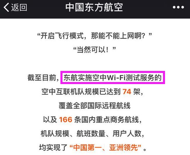 东航在去年早些时候就开通了机上Wi-Fi功能,