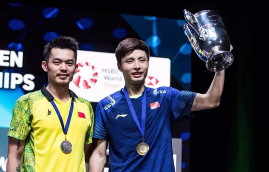 全英公开赛男单冠军石宇奇(右一),全英公开赛男单亚军林丹(左一)